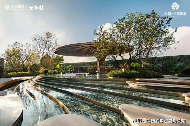 首先,大华公园柏翠利用12级叠水、2座树池、9步水上汀步,运用六重造景的手法打造近500平的中央水景!