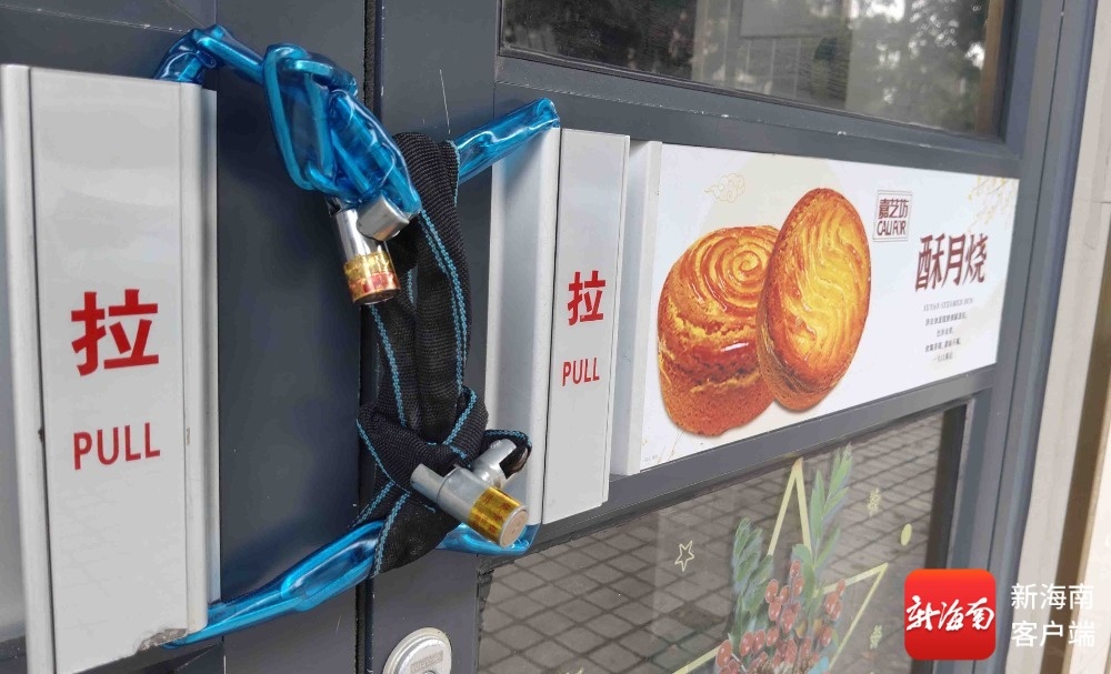记者随机对嘉艺坊蛋糕学院路店、海府路店、高登街店3家门店分别进行了走访。记者看到,3家门店内均没有员工,店门用铁链或防盗锁紧锁着,门店内仍放有货架、展柜、冰柜等设施设备。这些大门紧锁的门店玻璃门上,均贴有海南嘉艺坊食品有限公司张贴的“春节放假通知”,通知显示的为“2月25日(正月初九)恢复正常营业”。