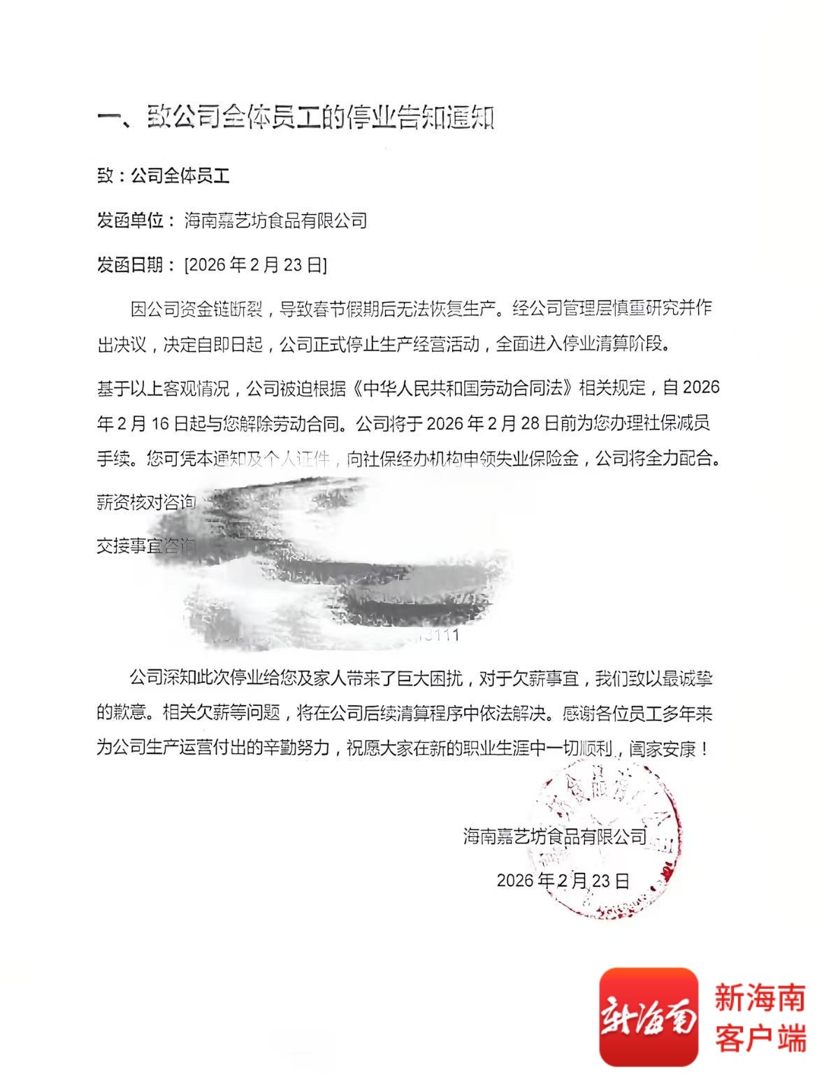 2月24日当天,一则发函单位为海南嘉艺坊食品有限公司的《通知》在网上疯传,根据内容显示,因公司资金链断裂,导致春节假期后无法恢复生产。经公司管理层慎重研究并作出决议,决定自即日起,公司正式停止生产经营活动,全面进入停业清算阶段。该公司将根据《中华人民共和国劳动合同法》相关规定,自2月16日起与员工解除劳动合同,并为员工办理社保减员手续。