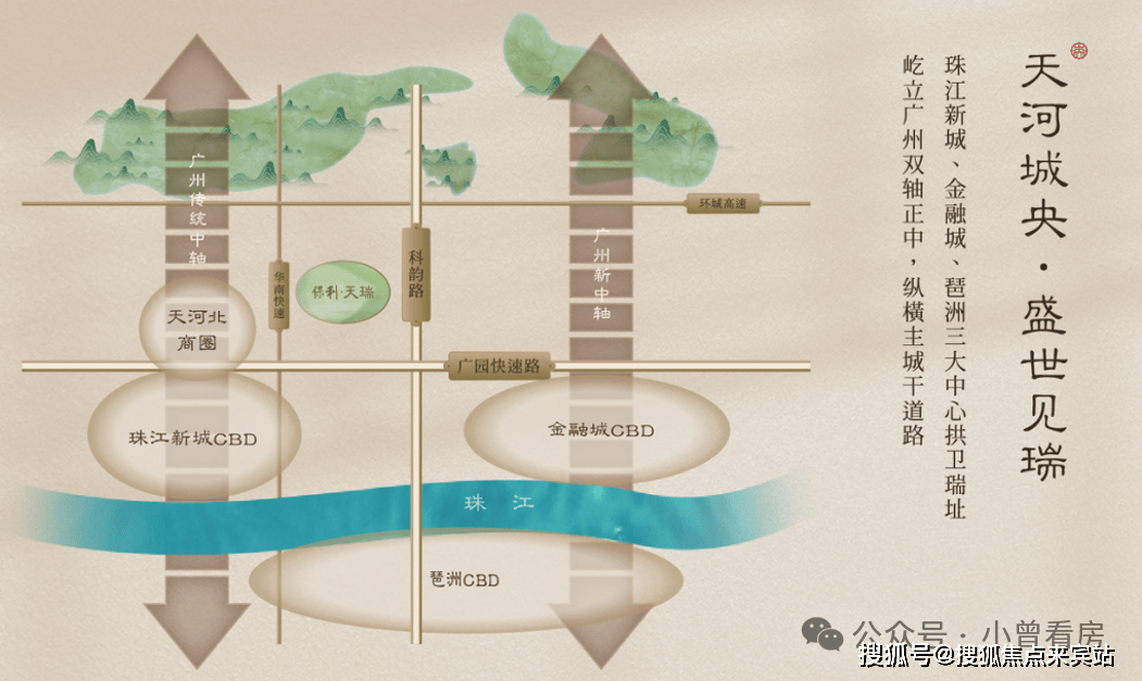 项目位于天河五山汇景新城板块内,珠江新城和琶洲金融城两中轴间的核心位置,楼盘身后就是汇景20年醇熟的圈层配套