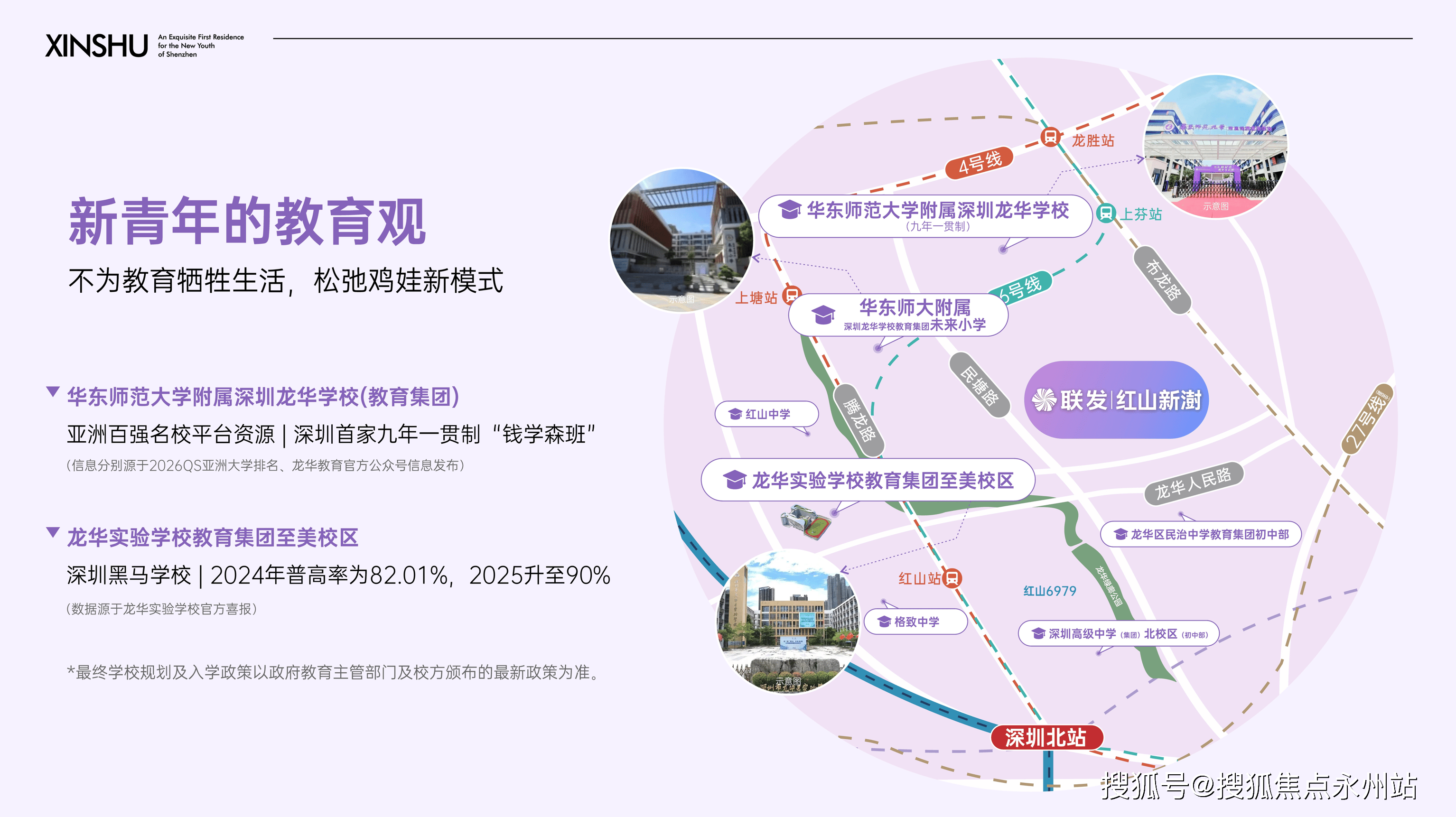 小学教育:对口华东师范大学附属龙华未来小学,该学校属于第二梯队学校,2025 年录取积分为第六类 62.1 分,非深户 + 学区租房即可入学,入学门槛相对较低。学校距离项目约1公里,步行即可到达。