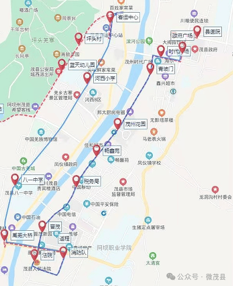 离场专线:茂县体育馆大门口→政府大楼楼下→光大→西羌家园酒店门口→二办公区停车场→九鼎桥桥头→半岛停车场→老茂北路路口