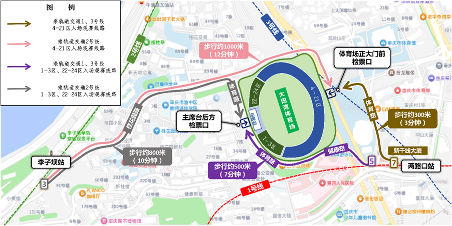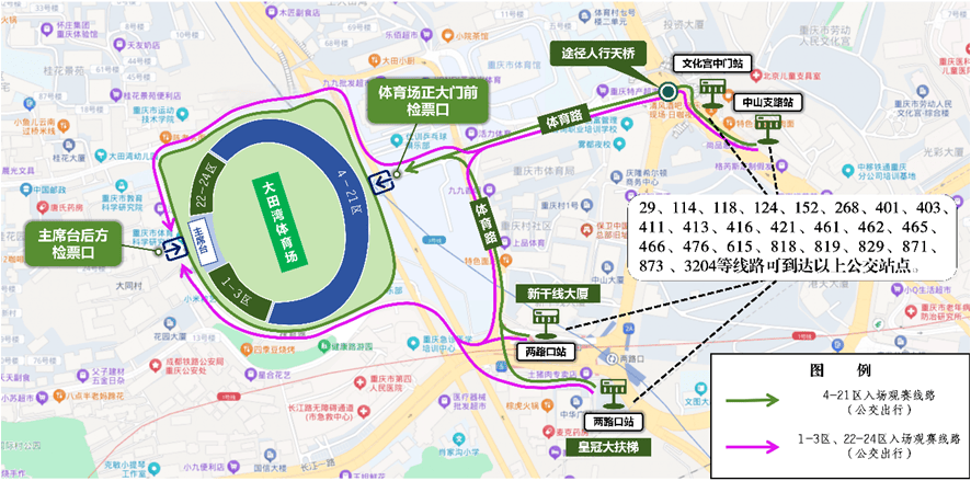 步行至体育场正大门后,沿体育路步行→主席台后方检票口;或经健康路→体育路→主席台后方检票口。入场指引图(公交出行)