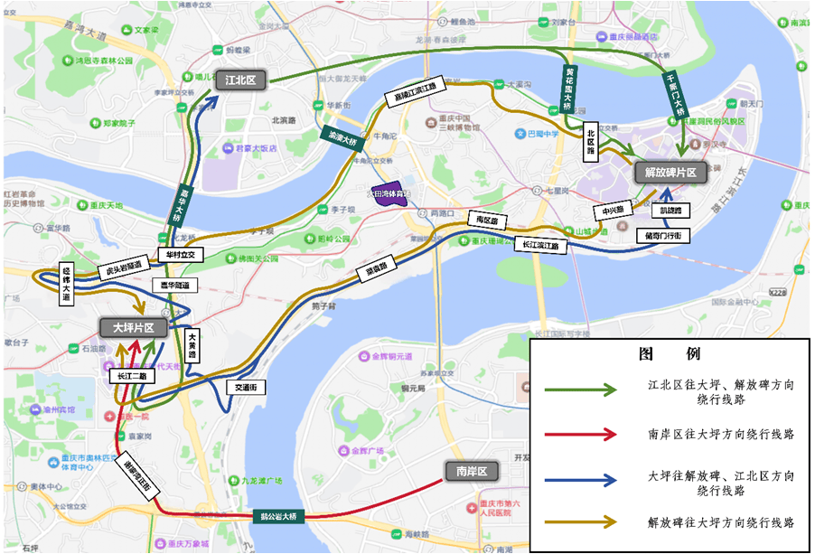 重点易堵路段:长江一路、两路口环道、渝澳大桥、上清寺转盘、体育路、桂花园路、中山二路、牛角沱立交、菜园坝长江大桥。
