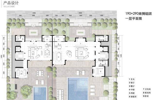 北入户的190+290房型,一层朝南直面庭院和泳池,如果配上整扇的落地玻璃移门......