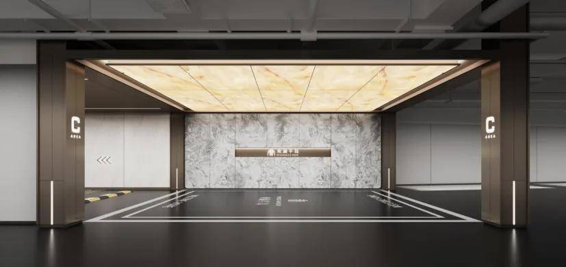 顶部透光仿云石装饰,地下车库大理石纹理的古典雅致与现代艺术的灵动韵律升华着业主的归家之旅。效果示意图