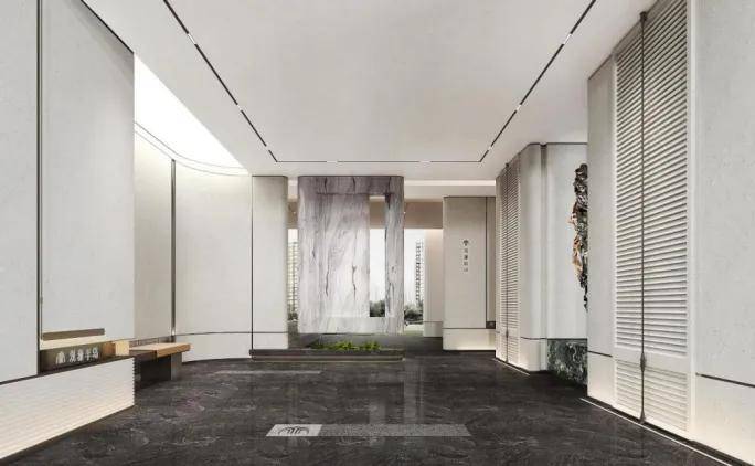顶部透光仿云石装饰,地下车库大理石纹理的古典雅致与现代艺术的灵动韵律升华着业主的归家之旅。效果示意图