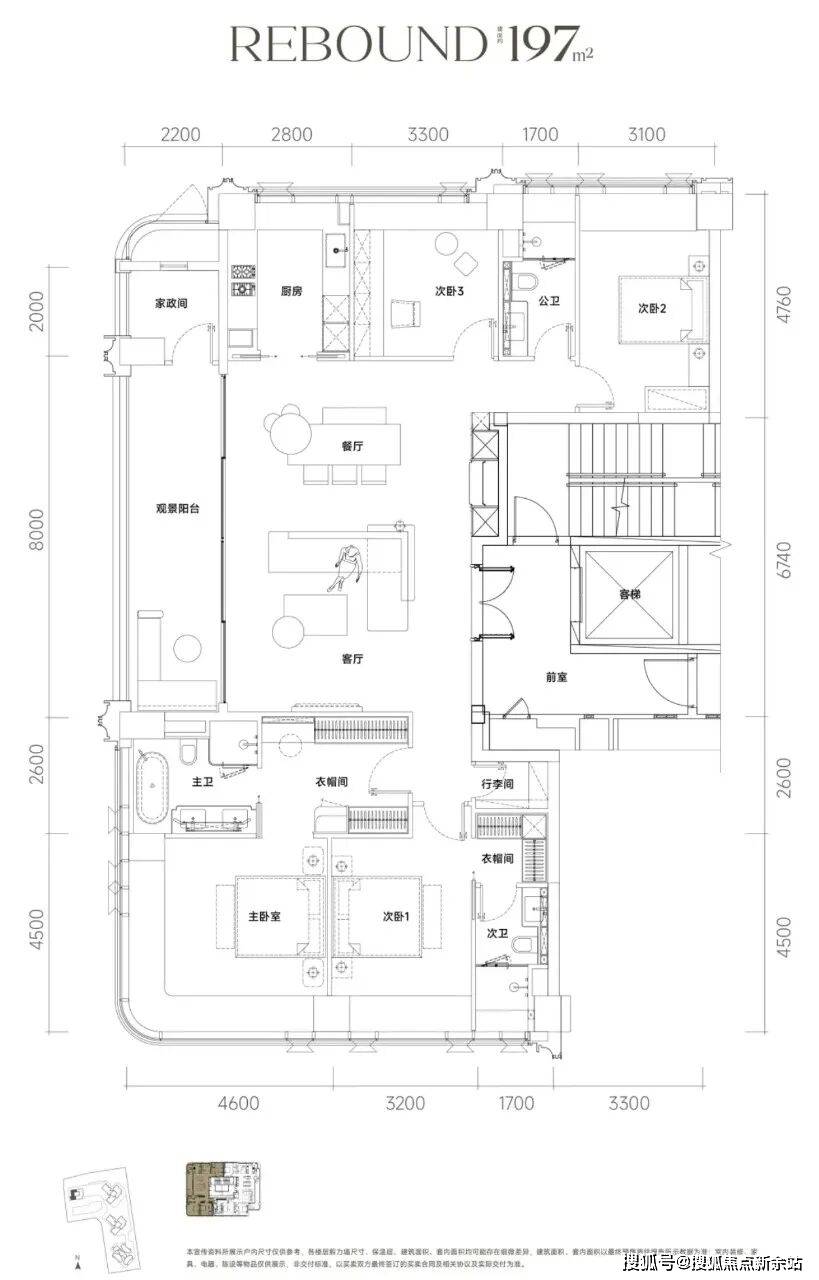 主力户型197-235㎡四房,南北通透,弧形阳台+玻璃幕墙,宣称100%使用率。