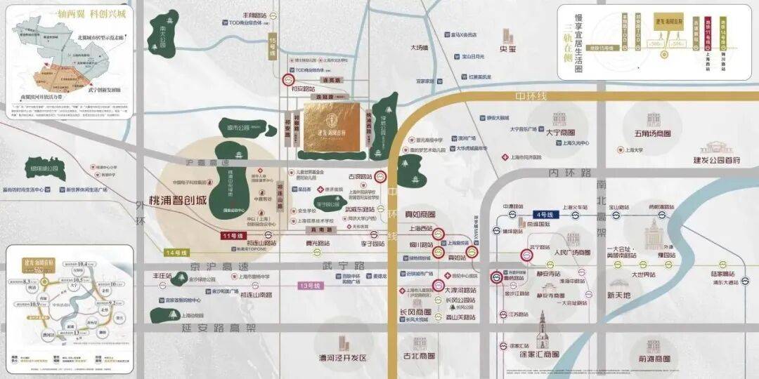 从项目出发,乘坐15号线站可抵达桃浦智创城核心区,便捷对接科创企业,满足商务出行需求;3站可抵达环球港商圈,轻松享受繁华商业配套;5站可抵达静安寺商圈,便捷享受高端消费与休闲娱乐;向西可直达宝山万达、顾村公园等成熟板块,向南可快速衔接徐家汇、前滩等核心区域,满足业主日常通勤、商务出行与休闲娱乐的多重需求。尤为值得一提的是,15号线大高铁枢纽,未来将吸引更多高新高知人才汇聚,而建发海阅首府作为三轨交旁的高端奢宅,将成为这些高智人群的首选居所,进一步提升项目的圈层价值与珍贵性。