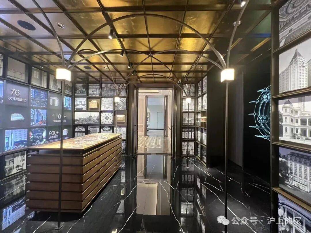远看,项目约10米挑高,以石材+玻璃穹顶打造的门头,整体形制神似外滩汇丰银行大厦,细节装饰又有外滩上海海关大楼的影子,海派建筑沉稳的气质扑面而来,让人一秒回到外滩万国建筑群,彰显居者的身份与品味。基座采用大面积石材铺设,质感厚重,历经岁月沉淀依旧焕发光彩;主体立面采用大面积铝板打造,极致通透又温润雅致,铝板材质不仅质感出众,更具有耐腐蚀、抗老化、易清洁等优势,能够长期保持建筑的美观;顶部则采用香槟金色格栅装饰,搭配玉兰花造型的玻璃顶,将海派与现代之美生动演绎,成为板块内极具辨识度的建筑地标。