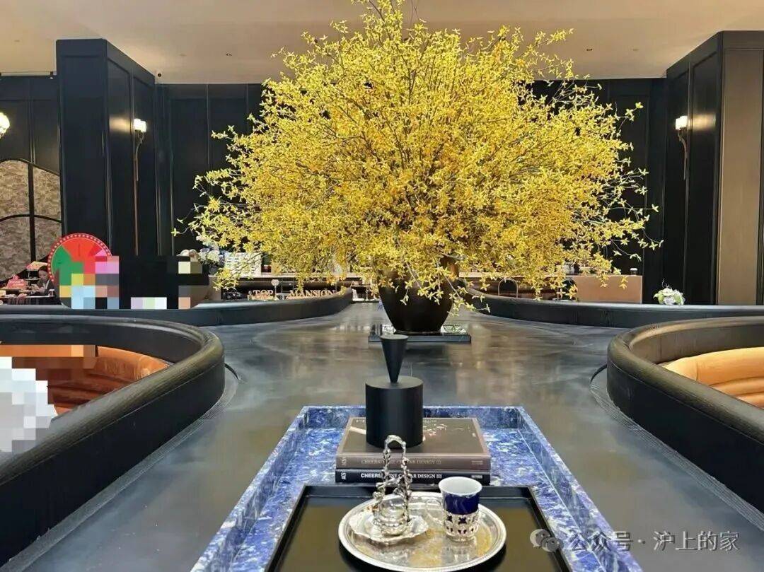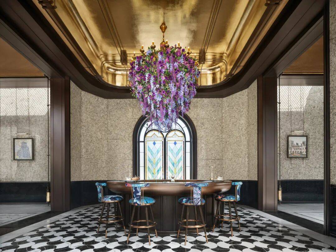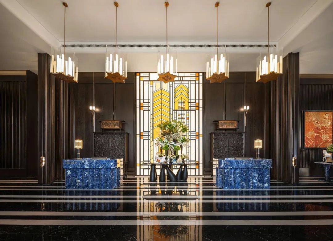 继续向里走,廊道内可见经典的石材立柱、拱形的吊顶、PRADA荣宅的手绘彩玻、繁花的地面拼花等用材工艺,移步异景间,是别样的摩登魅力。穿过海派花厅与艺术长廊,一路引入眼帘的彩绘花窗,以银杏和玉兰花瓣结合的原创拼花元素,象征玉兰为心的上海精神,也融汇了荣宅、和平饭店等经典建筑里的纹样,每一处细节都彰显着海派文化的底蕴与匠心。